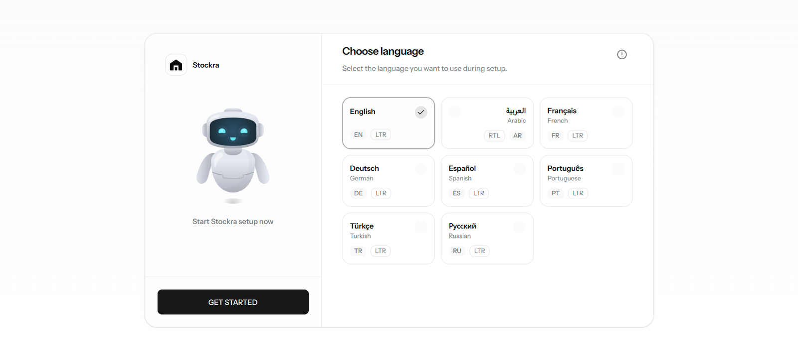 A list of available languages (e.g., English, العربية, Français, Deutsch, Español, Português, Türkçe, Русский)