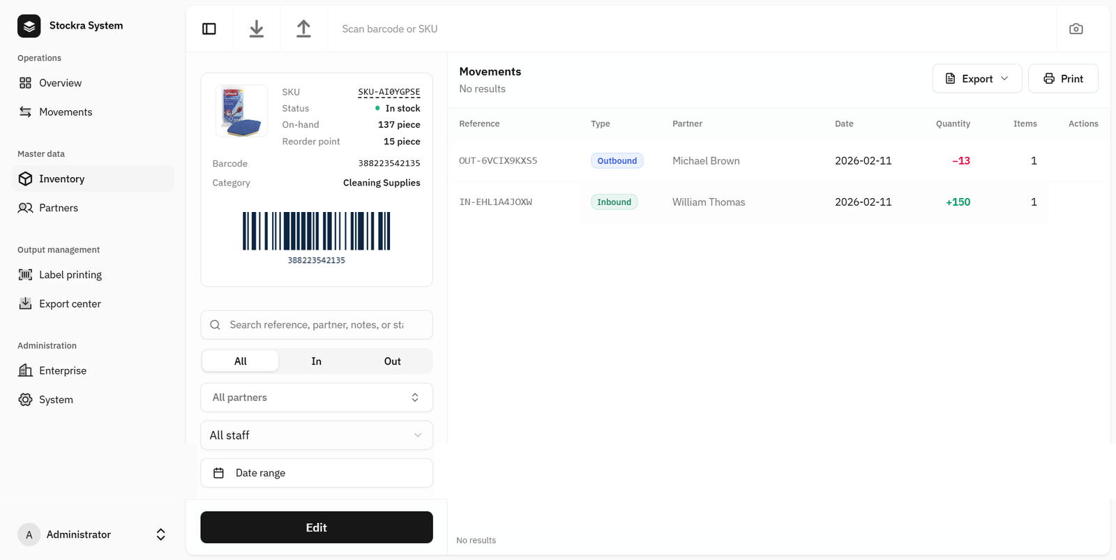 3. If on-hand is at/below reorder point, plan replenishment and record an inbound receiving movement when stock arrives.