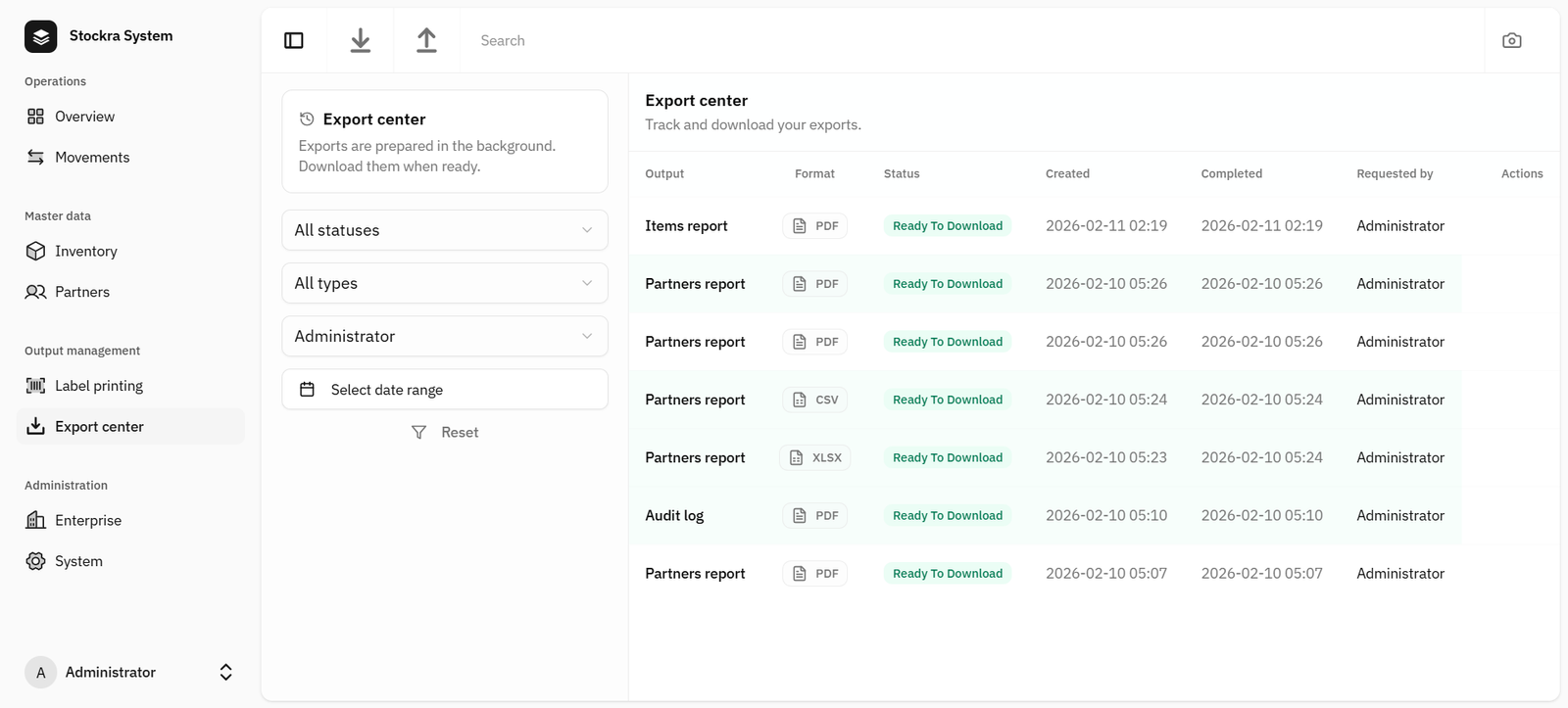 Generate an export from any module (Inventory, Movements, Partners, Audit Log, etc.).
