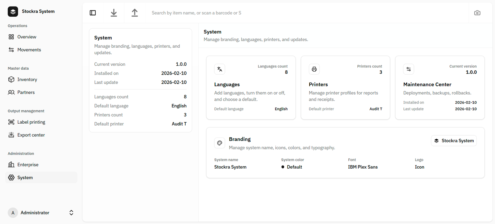 The System section contains the core configuration that controls how Stockra looks and behaves globally. It is the place to manage branding, enabled languages, printer profiles, and maintenance/updates. Administrators use this area to keep the UI consistent, configure output devices, and maintain the installation lifecycle (version, install date, updates).