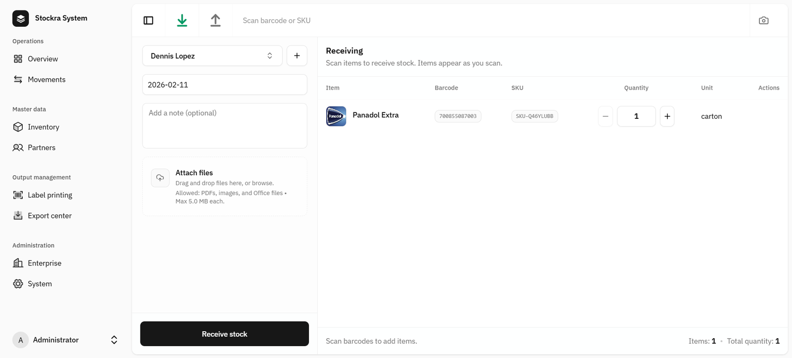 Use attachments for supplier invoices and delivery notes to keep movement records complete.