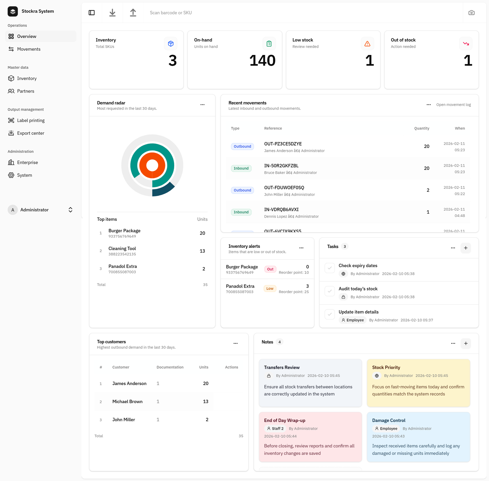 Shows the latest inbound/outbound movements with reference, type, quantity, and timestamp. This gives supervisors and operators quick traceability of what changed recently and supports fast verification during busy shifts.