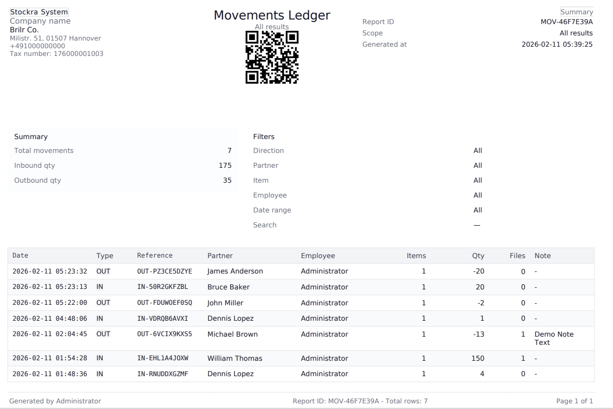 Stockra provides enterprise-style reports that can be printed directly or exported as PDF files for archiving, sharing, and auditing. Reports follow a consistent layout across modules (Inventory, Movements, Partners, Audit Log, etc.), so users always know where to find key metadata, filters, and totals.
